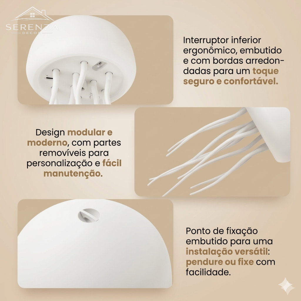 Seus tentáculos flutuantes e iluminação colorida criam um efeito hipnotizante e relaxante, como se uma água-viva estivesse nadando no ar.